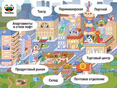В Toca Life: City вас ждут шесть разнообразных локаций, включая театр, торговый центр и фуд-парк. Вы можете менять прически, красить волосы и подбирать наряды в салоне Hair 3000. Создавайте уникальных персонажей, используя десятки причесок, цветов и аксессуаров. Каждый уголок города скрывает сюрпризы, которые вы можете открыть, исследуя его.