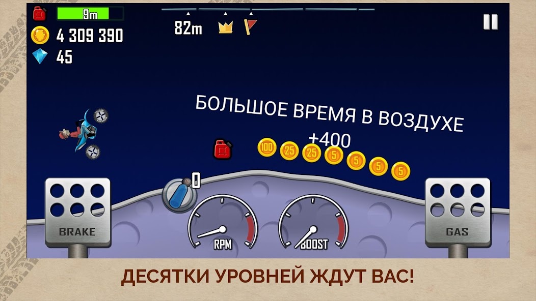 Hill Climb Racing — это аркадная игра, где вы управляете транспортом, преодолевая сложные трассы. Ваша цель — проехать как можно дальше, собирая монеты и избегая переворотов. Управление простое: газ и тормоз, но именно от вашего мастерства зависит, сможете ли вы удержать баланс на крутых подъемах и спусках.