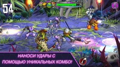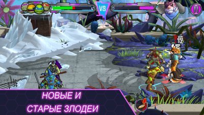Вы управляете сразу четырьмя черепашками, используя их уникальные способности для атаки и защиты. Проведите пальцем по экрану, чтобы нанести удар, или активируйте командные атаки для максимального урона. В игре вас ждут пять миров, включая ледяные пустоши, вулканические ландшафты и даже технодром Крэнга.