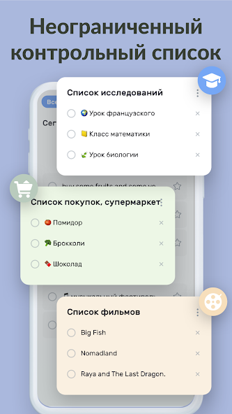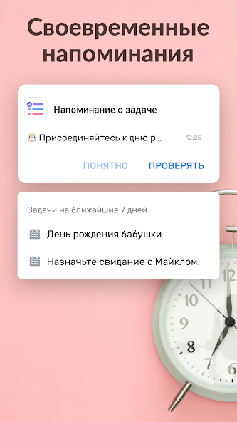 Приложение позволяет создавать ежедневные и долгосрочные списки дел всего за пару шагов. Вы можете добавлять задачи, сортировать их по приоритетам и выделять наиболее важные дела. Удобная система напоминаний гарантирует, что вы ничего не забудете, а возможность добавлять подзадачи обеспечивает гибкость в планировании. Специальные категории и пометки помогают лучше организовать время, а встроенный календарь позволяет отслеживать прогресс. Эти функции превращают приложение в универсальный инструмент планирования.