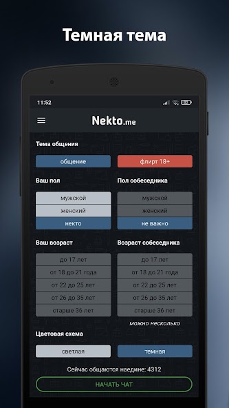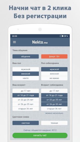 В NektoMe вы можете начать текстовый или голосовой чат с человеком, соответствующим вашим предпочтениям по возрасту и полу. Система случайного выбора собеседников делает каждую беседу неожиданной и интересной. Вы сами решаете, продолжать разговор или искать нового собеседника.