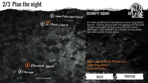 Геймплей разделён на два этапа. Днём вы укрепляете убежище, готовите еду, чините оборудование и заботитесь о раненых. Ночью отправляетесь на вылазки за ресурсами, где вас ждут опасности: от мародёров до военных патрулей. Каждое действие требует планирования, ведь ресурсы ограничены, а время неумолимо.