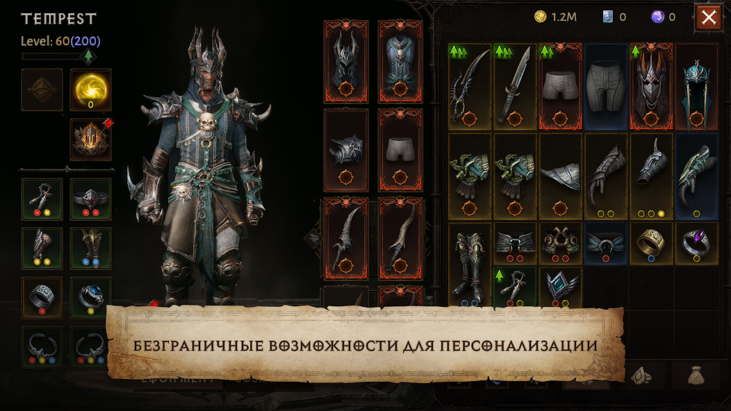 - Сбор легендарного снаряжения и самоцветов для усиления способностей.