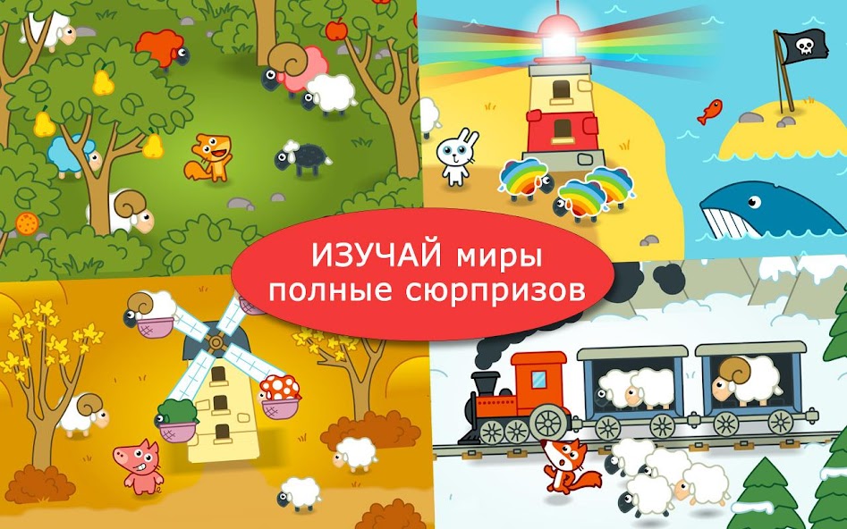 Игра предлагает пять уникальных ландшафтов, включая цветущие равнины, леса, снежные вершины и берега рек. Белочка, Хрюша, Кролик и Лисичка помогут вам исследовать эти места, делая процесс поиска овец ещё более увлекательным. Каждый мир полон деталей и интерактивных элементов, которые делают игру живой и интересной.