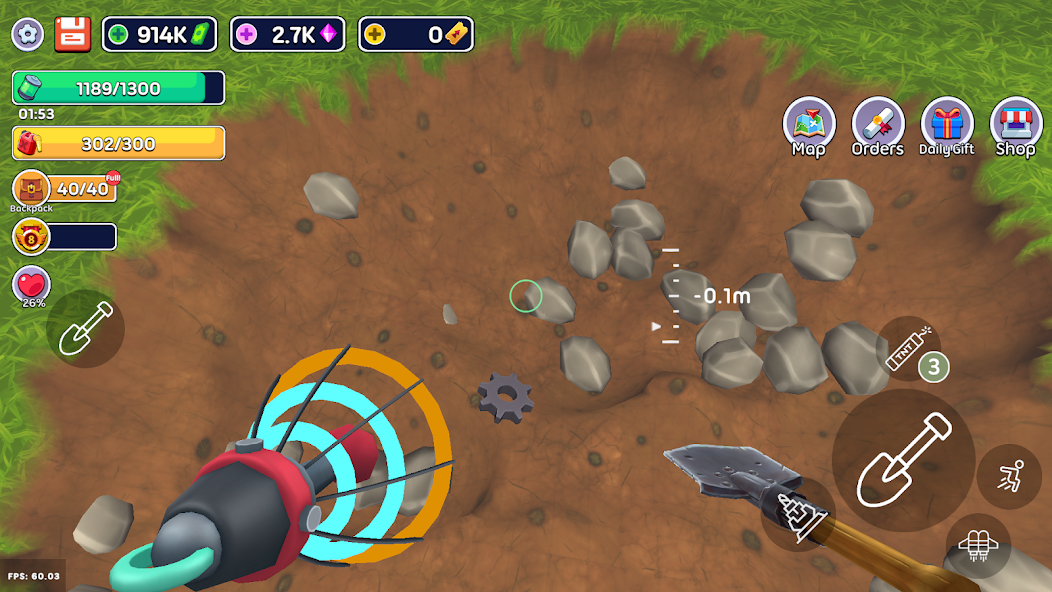 Ваш путь к успеху начинается с базовых инструментов, которые можно улучшать. Прокачивайте лопату, чтобы копать быстрее и глубже. Увеличивайте размер рюкзака, чтобы собирать больше находок за один раз. А джетпак станет вашим верным помощником для быстрого возвращения на поверхность. Каждое улучшение приближает вас к заветной цели.