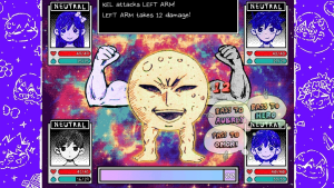 В OMORI вы управляете командой из четырёх персонажей, каждый из которых обладает уникальными навыками. Боевая система основана на пошаговых сражениях, где эмоции играют ключевую роль. Например, злость увеличивает атаку, но снижает защиту, а грусть повышает стойкость, но замедляет действия. Используйте предметы, навыки и взаимодействие между героями, чтобы побеждать врагов и продвигаться по сюжету.