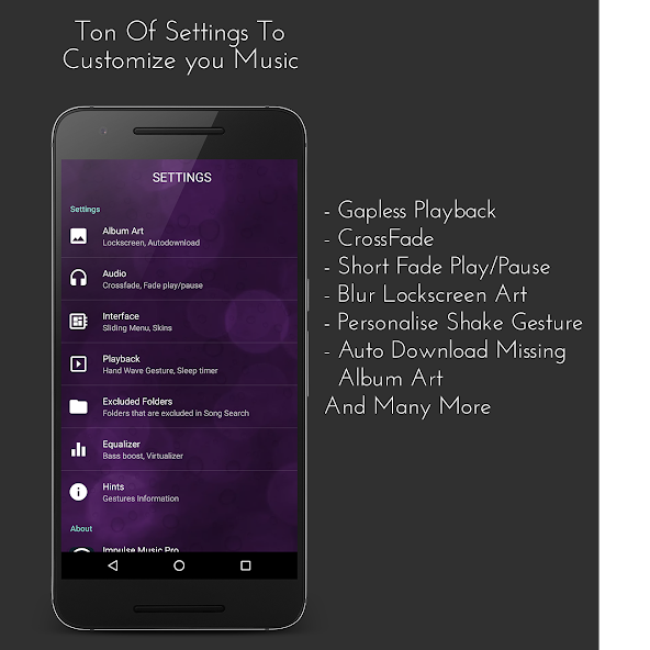 Impulse Music Player Pro – это уникальный музыкальный плеер для Android, который предлагает управление на основе жестов. Благодаря этому приложению вы можете наслаждаться музыкой, не отвлекаясь на кнопки или сложные меню. Оно идеально подходит для тех, кто ищет минимализм и удобство, будь то во время пробежки, за рулем или в повседневной суете.