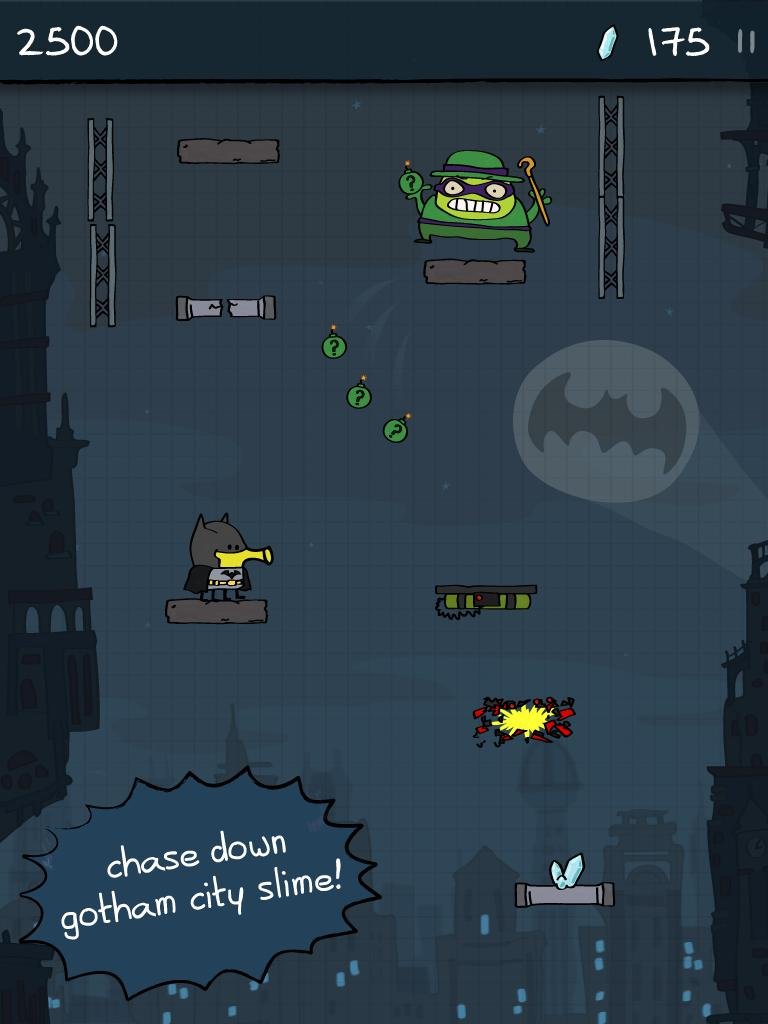 Doodle Jump DC Super Heroes — это не просто прыжки, а настоящее приключение в мире DC. Патрулируйте крыши, очищайте город от зла и докажите, что Бэтмен всегда на страже. Готэм верит в вас, и только вы можете вернуть ему покой.