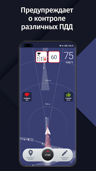 - Оповещения: приложение заранее предупреждает о стационарных и мобильных камерах, а также о временных знаках.