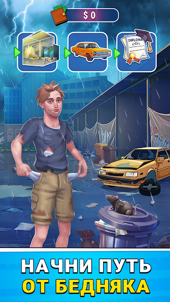 Cash Masters: Бизнес Империя — это симулятор, где вы начинаете с нуля и строите свою бизнес-империю. Ваша цель — пройти путь от уличного мечтателя до влиятельного магната, принимая стратегические решения и управляя финансами. Игра предлагает множество возможностей для развития, от инвестиций до создания семьи.