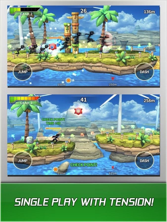 RUN'n'FLY предлагает не только одиночный режим, но и мультиплеер, где до четырёх участников соревнуются за звание самого быстрого. Это добавляет игре соревновательный дух и делает её ещё более увлекательной.
