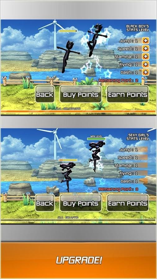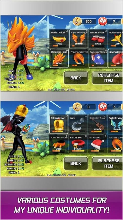 Собранные молнии увеличивают скорость, а специальные улучшения дают кратковременное ускорение. Пройденное расстояние конвертируется в опыт, который позволяет улучшать характеристики персонажа: дальность прыжка, выносливость и скорость. Это делает каждую попытку уникальной и добавляет элемент прогресса.