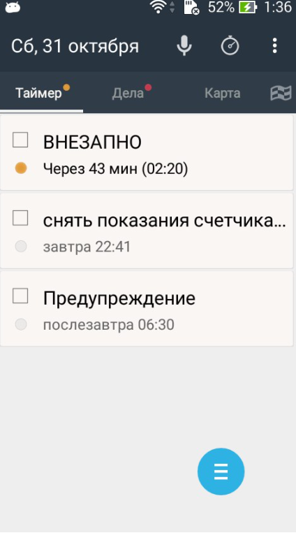 - Таймеры для коротких интервалов, чтобы не забыть, например, перезвонить через 30 минут.
