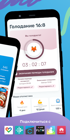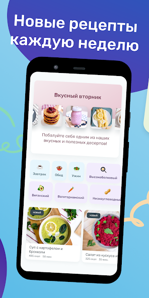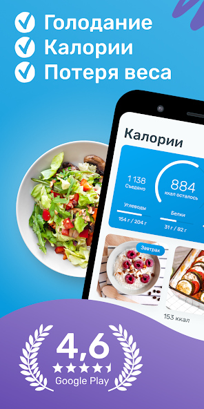 - Дневник питания, где вы можете записывать приёмы пищи и создавать собственные рецепты.