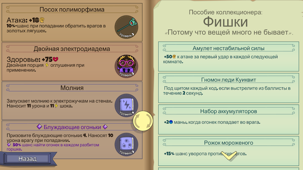 Игра предлагает ежедневные головоломки и еженедельные забеги с уникальными правилами. Вы можете соревноваться с другими на глобальных таблицах лидеров, стремясь к лучшим результатам. А система "перманентной смерти с бонусами" позволяет сохранить особые артефакты для следующего прохождения, если вы собрали достаточно золота.