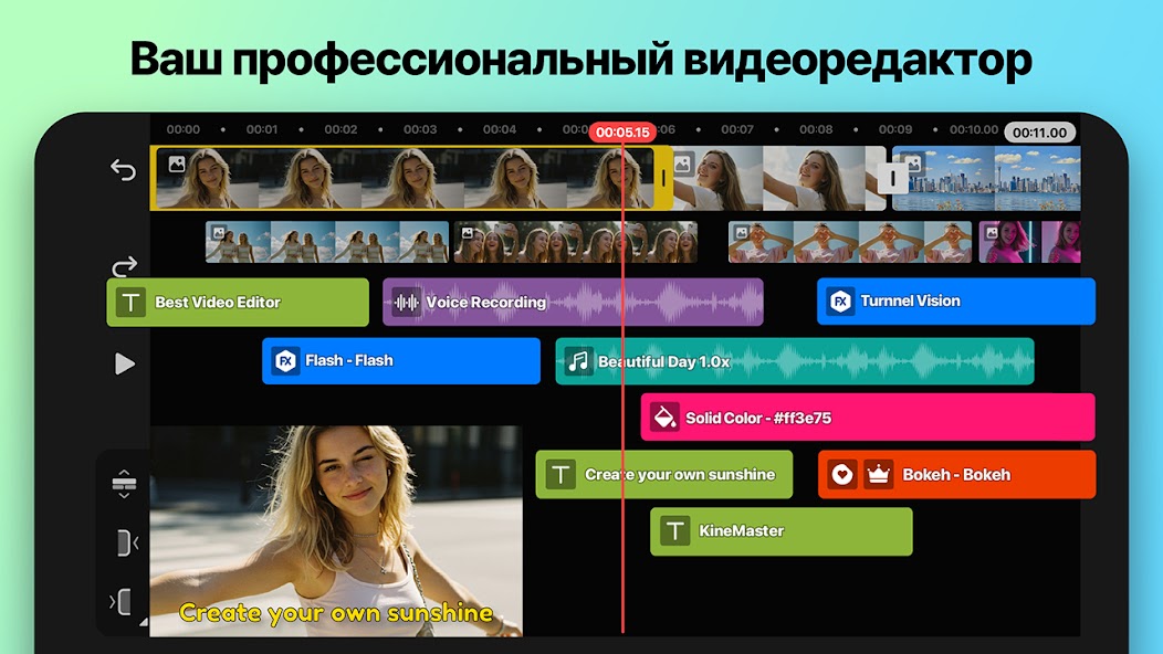 KineMaster удивляет богатством инструментов для редактирования видео, позволяя создавать проект именно так, как вы его себе представляете. В вашем распоряжении: