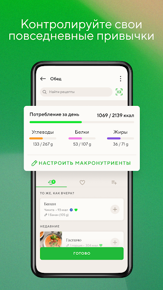 Приложение предлагает удобный дневник питания, где вы можете добавлять продукты с помощью сканера штрихкодов или вручную. Вы также получаете доступ к трекеру воды, макронутриентов и даже схемам интервального голодания. Для тех, кто хочет больше, доступны персонализированные планы питания, включая кетодиету, средиземноморскую диету и даже экодиету.