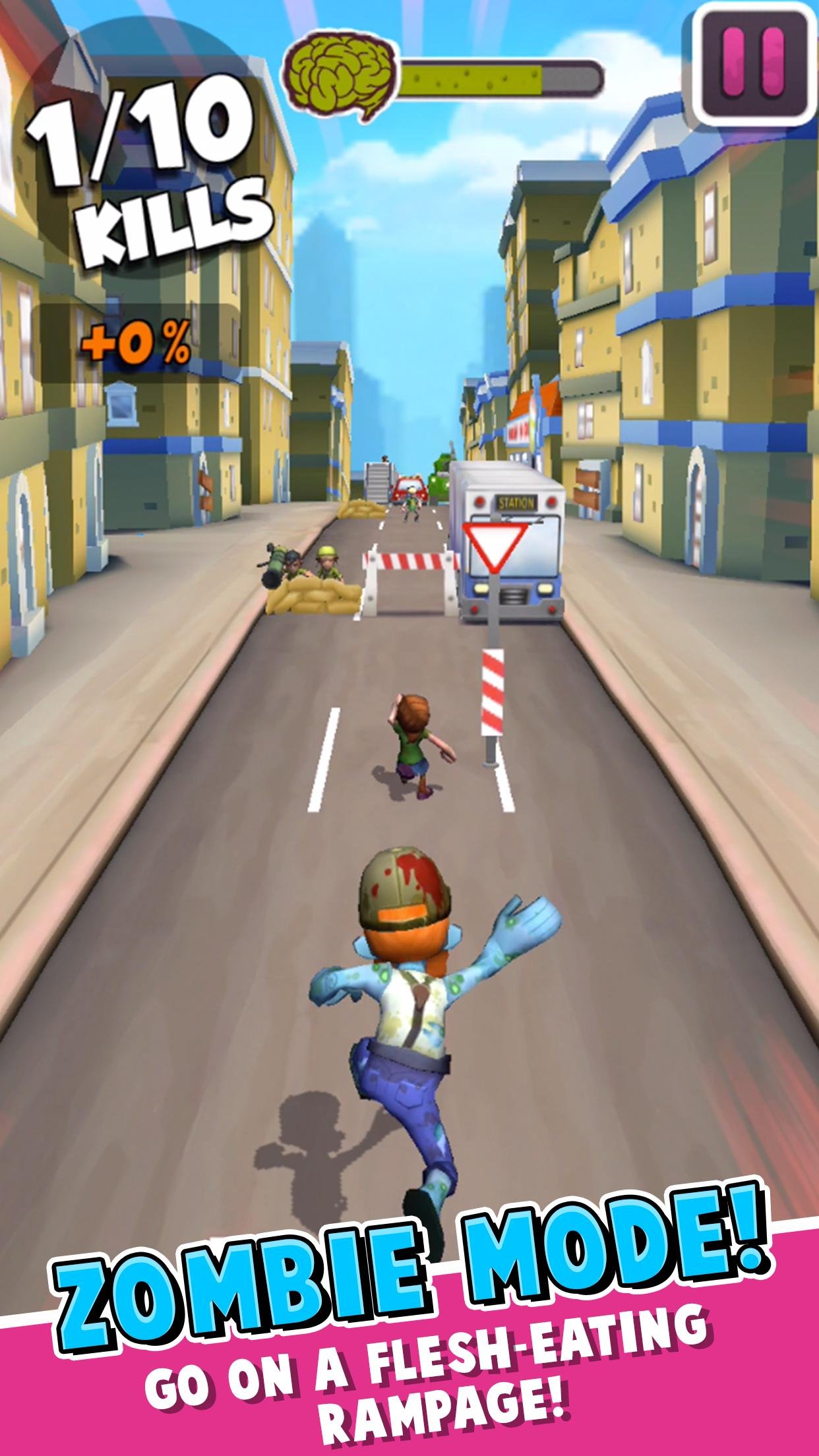 Undead City Run — это захватывающий раннер, где вы оказываетесь в городе, захваченном зомби. Ваша цель — выжить, избегая орд ходячих мертвецов, баррикад и других препятствий. Управление интуитивное: свайпы влево и вправо для перемещения, вверх — прыжок, вниз — перекат. В процессе вы находите оружие, которое автоматически используется для защиты. Но будьте осторожны: если зомби настигнут вас, игра не заканчивается — вы сами превращаетесь в мертвеца и начинаете охотиться на выживших.