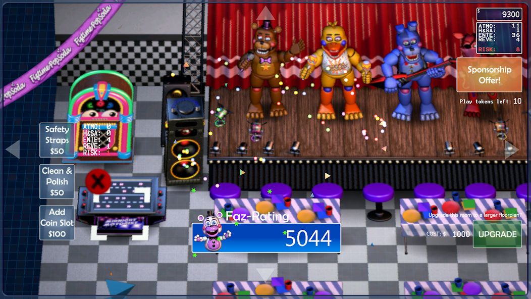 В дневное время вы занимаетесь развитием своего заведения. Покупайте оборудование, добавляйте аттракционы и нанимайте аниматроников, чтобы привлечь больше клиентов. Однако каждое решение несёт за собой последствия: некоторые аниматроники могут быть опасны, а спонсорские предложения добавляют шума, что усложняет ночные смены. Ваша задача — найти баланс между прибылью и безопасностью.