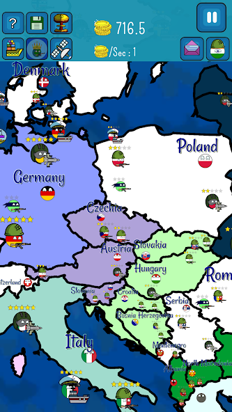Создавайте мощные вооруженные силы, включая пехоту, флот и авиацию. Захватывайте страны, сравнивая силы вашей армии с армиями противников. Если вы хотите ускорить процесс, используйте ядерное оружие, чтобы сокрушить сопротивление. Каждое завоевание приближает вас к статусу величайшего диктатора.
