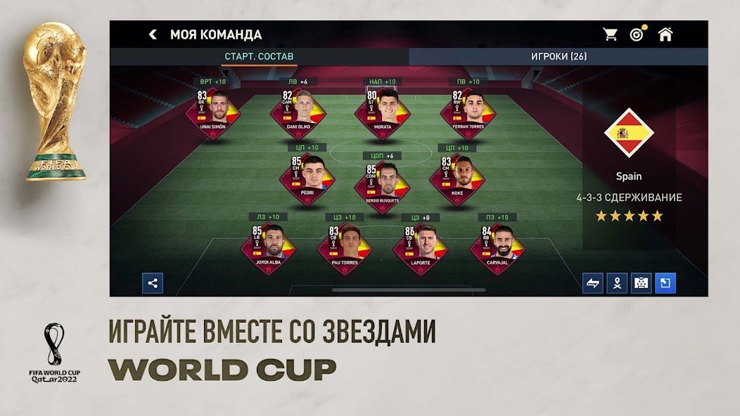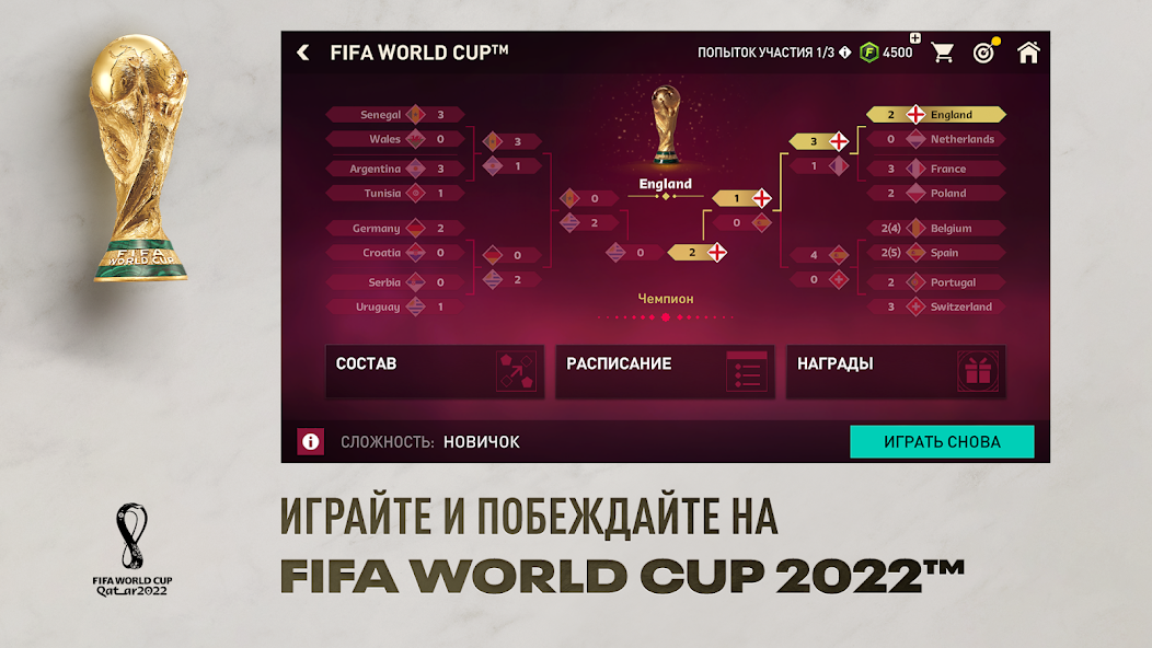 - Чемпионат мира: Участвуйте в турнирах с официальными сборными и стадионами.