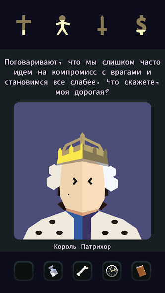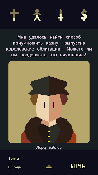 Геймплей строится на выборе между двумя вариантами, представленными на картах. Каждое решение меняет отношение к вам различных групп. Например, поддержка армии может ослабить доверие народа, а щедрые траты на церковь истощат казну. Ваша цель — удерживать баланс, чтобы избежать бунтов, голода или религиозных преследований.
