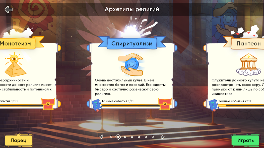 Игра предлагает множество архетипов религий, включая единобожие, шаманизм, спиритуализм и язычество. Каждая из них имеет свои особенности и уникальные способности. Вы можете развивать культуру, создавать чудеса и даже бороться с фанатизмом, чтобы сохранить баланс. Ваши решения определят, станет ли ваша религия источником вдохновения или причиной конфликтов.