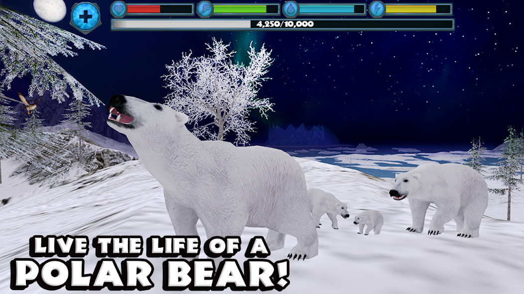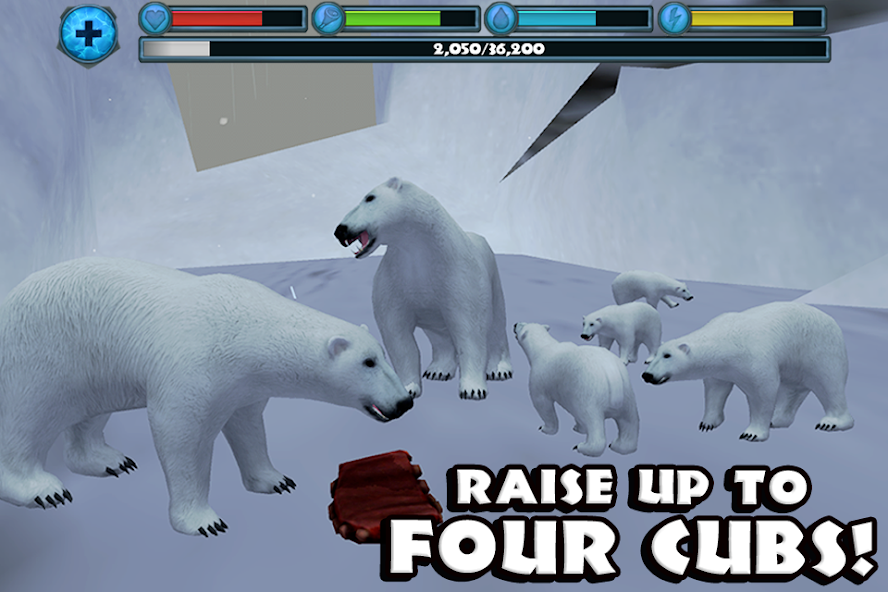 В Polar Bear Simulator вы можете найти партнера и вырастить до четырех медвежат. Они будут расти, становиться сильнее и помогать вам в охоте и защите территории. Прокачивайте своих медведей, чтобы улучшить их способности, открыть новые цвета меха и освоить уникальные навыки, такие как режим скрытности.