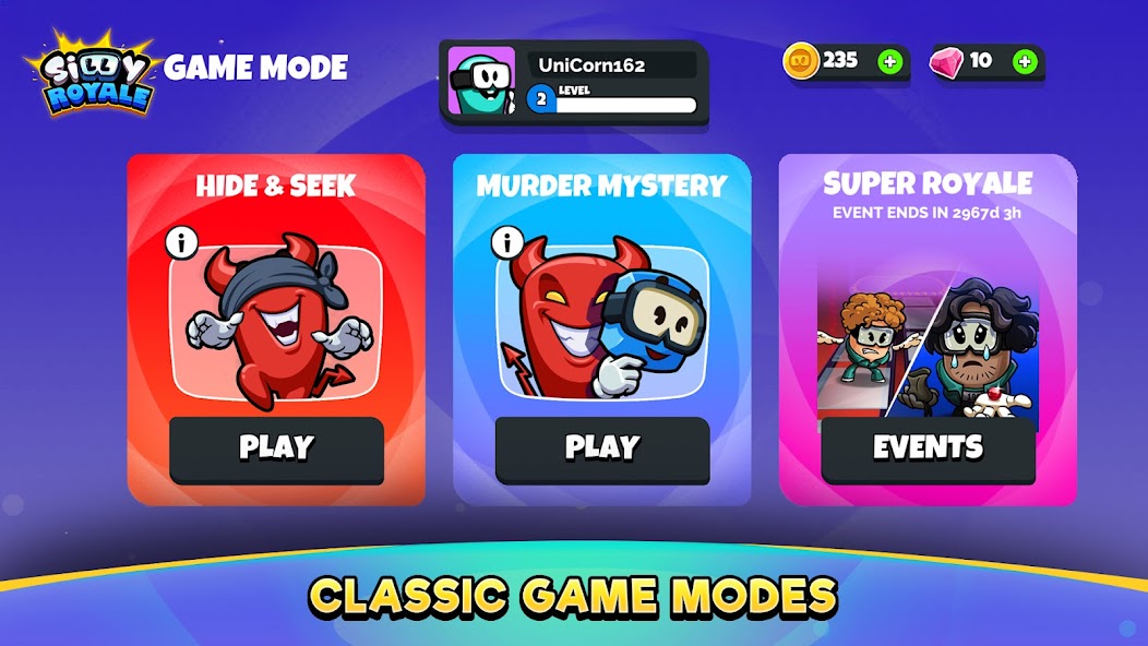 В Silly Royale вы можете выбрать один из нескольких режимов. В «Прятках» вы прячетесь от Дьявола, выполняя задания, или сами становитесь охотником. В «Тайне убийства» вам нужно вычислить предателя среди друзей, а в «Побеге из тюрьмы» — организовать дерзкий побег или поймать нарушителей. Каждый режим предлагает уникальные задачи и стратегии.
