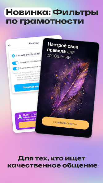 Фотострана использует интеллектуальный поиск, чтобы подобрать для вас наиболее подходящих собеседников. Учитываются ваши интересы, предпочтения и даже грамотность. Приложение заботится о конфиденциальности, модерируя анкеты и фильтруя переписки, чтобы создать комфортное пространство для общения.